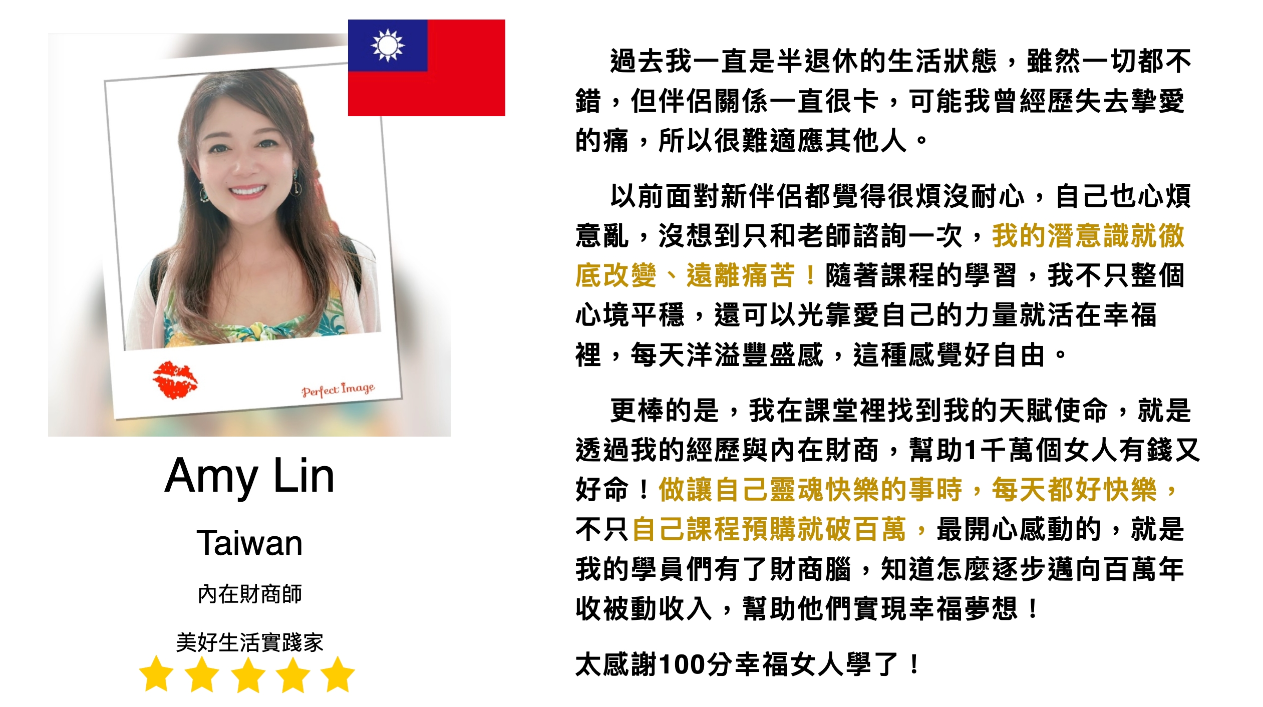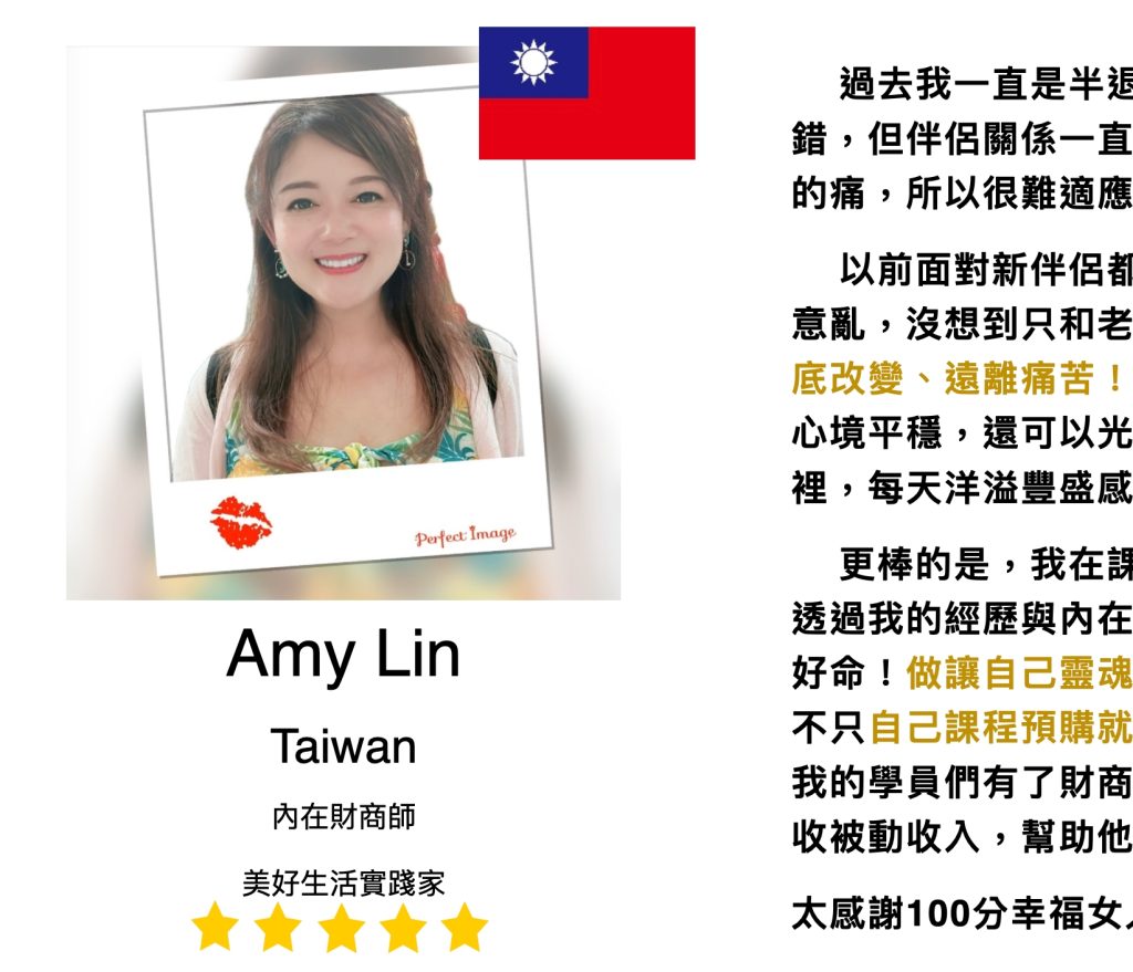 更令人驚喜的是,Amy 不只在伴侶關係上鬆動了結,還在課程裡找到屬於自己的天賦使命。她結合自己的人生經歷與內在財商,開始幫助成千上萬的女性打造「有錢又幸福」的人生。